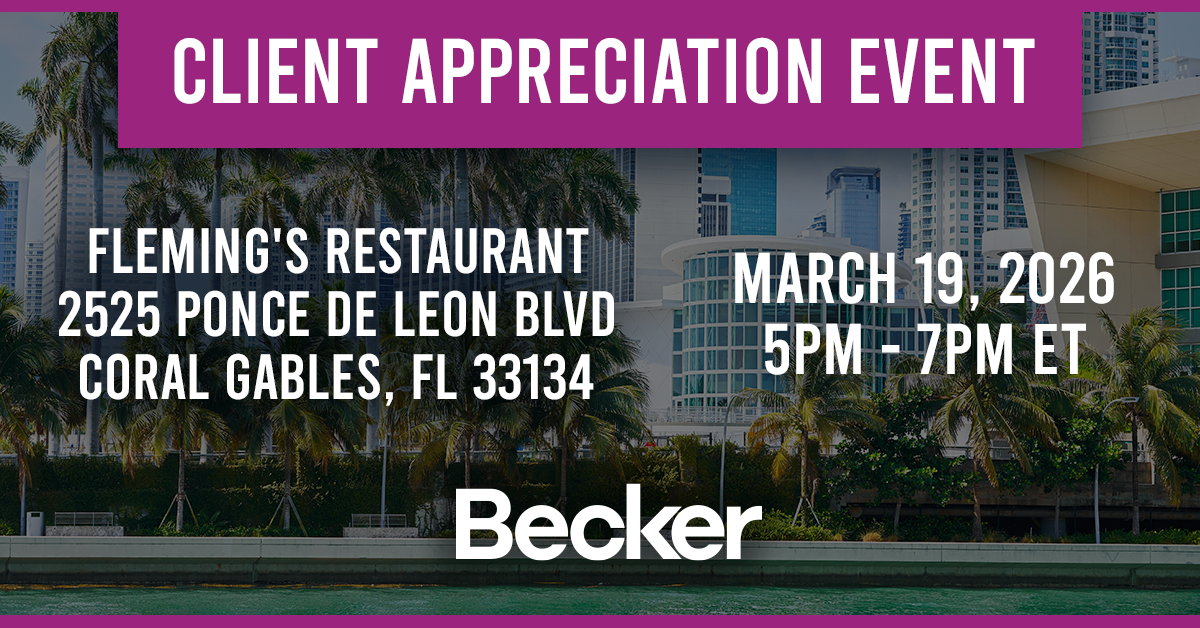 We’re pleased to invite you to an in-person Client Appreciation Event at Fleming’s Prime Steakhouse, 2525 Ponce de Leon Blvd, Coral Gables, FL 33134, located on the ground floor of Becker’s Coral Gables office.
