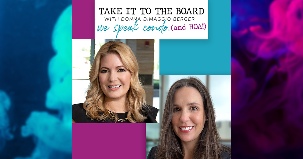 Think you know what community association life is all about? Think again. Residents must obey the rules, directors must follow the law, and managers must keep it all running smoothly. Take It To the Board explores the reality of life in a condominium, cooperative or homeowners’ association, what’s really involved in serving on its board, and how to maintain that ever-so-delicate balance of being legally compliant and community spirited. Leading community association attorney Donna DiMaggio Berger acknowledges the balancing act without losing her sense of humor as she talks with a variety of association leaders, experts, and vendors about the challenges and benefits of the community association lifestyle. Don’t have a streaming app? You can now find all episodes on YouTube! Click here to listen now.