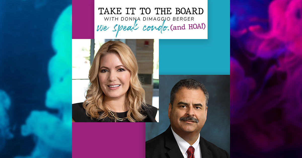 Think you know what community association life is all about? Think again. Residents must obey the rules, directors must follow the law, and managers must keep it all running smoothly. Take It To the Board explores the reality of life in a condominium, cooperative or homeowners’ association, what’s really involved in serving on its board, and how to maintain that ever-so-delicate balance of being legally compliant and community spirited. Leading community association attorney Donna DiMaggio Berger acknowledges the balancing act without losing her sense of humor as she talks with a variety of association leaders, experts, and vendors about the challenges and benefits of the community association lifestyle. Don’t have a streaming app? You can now find all episodes on YouTube! Click here to listen now.